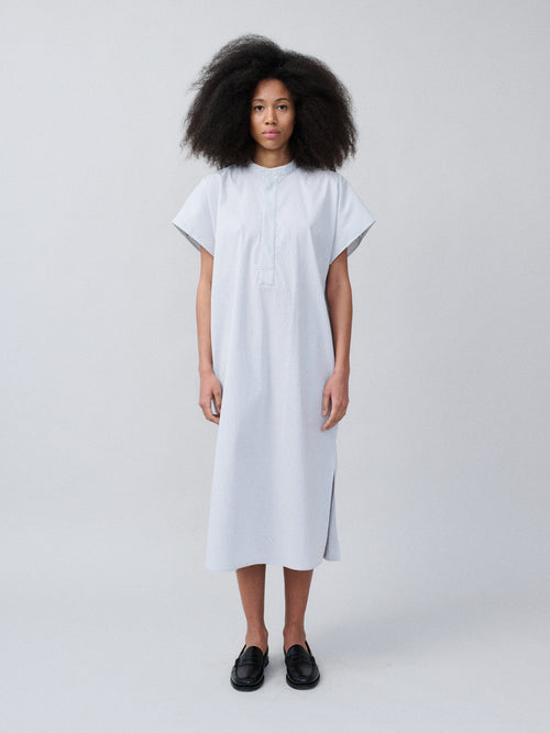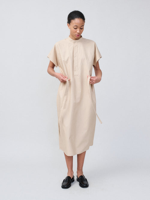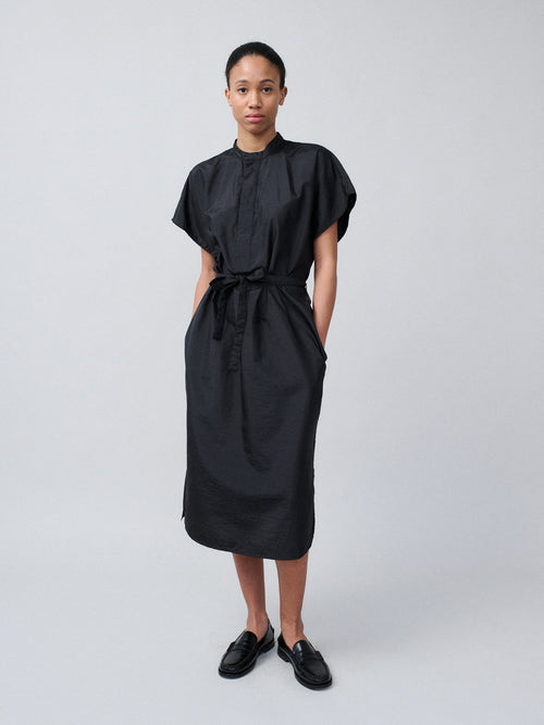 A floor length dress in cupro with a fluid silk like surface and a natural sheen that supports the way the dress moves and settles. The front stays clean and straight while the back opens into soft layers that fall naturally. The length pools slightly around the feet and the movement has a softer weight with the fabric falling in a cool smooth drape.